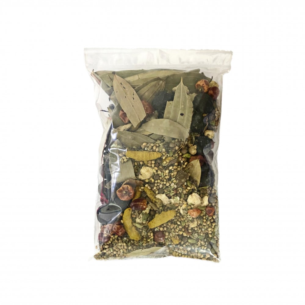 بصل,كزبره,ثوم,فلفل اسود,قرفه,زنجبيل,هيل,قرنفل,ورق غار,شمار,ليمون صومالي, كمون